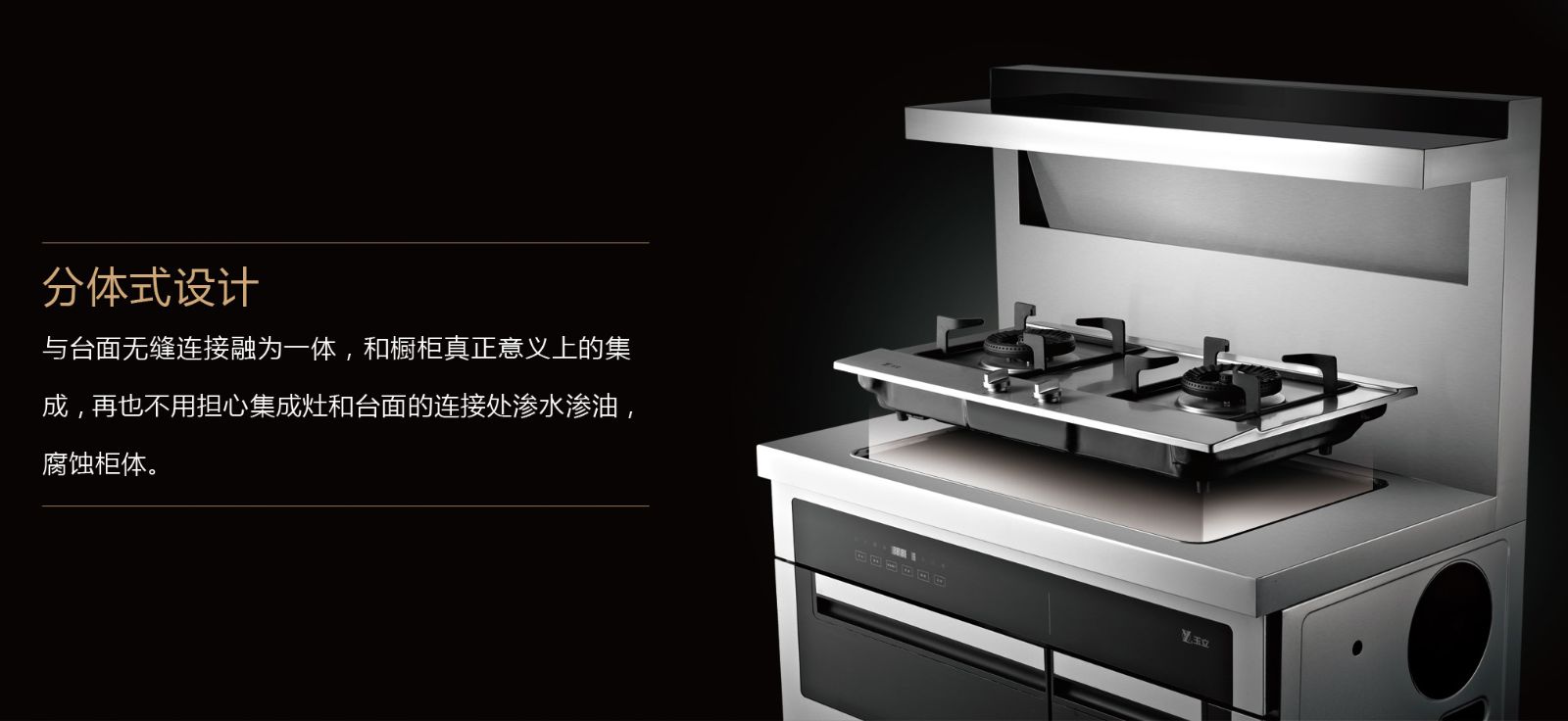 與臺面無縫隙連接為一體,和櫥柜真正意義上的集成,再也不用擔心集成灶和臺面的連接處滲水滲油,腐蝕柜體。