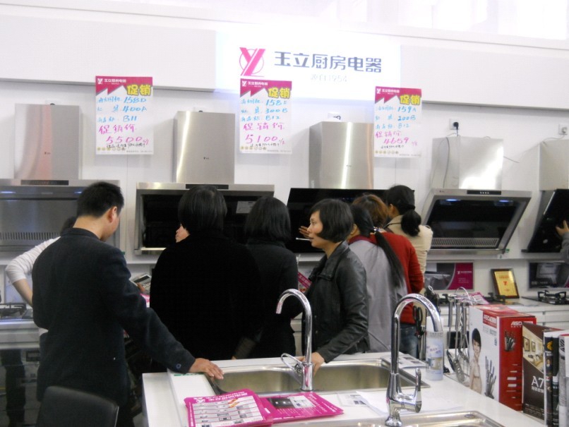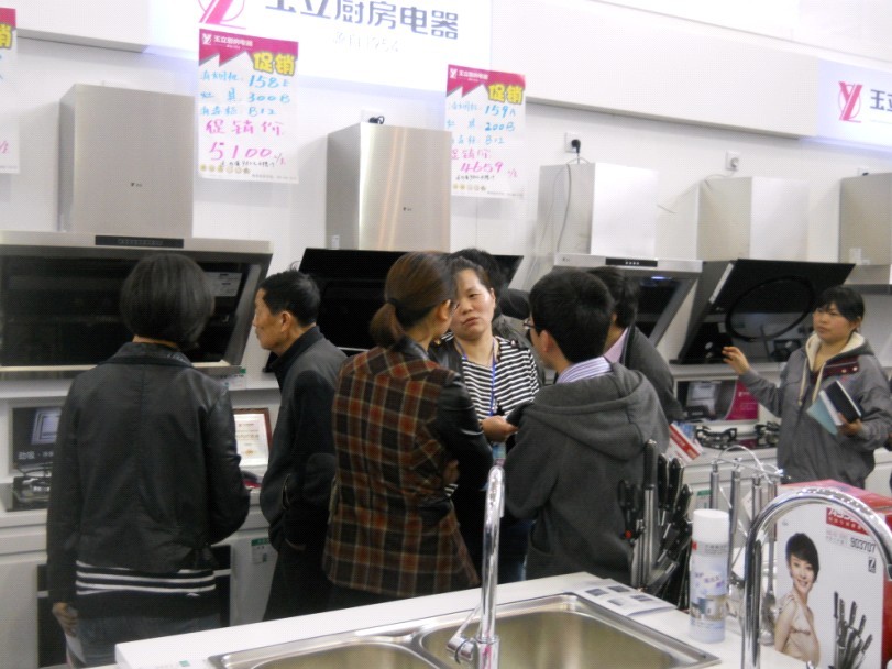 (體驗(yàn)玉立常規(guī)廚電的顧客們并商量著下訂單)